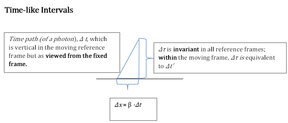 The student should demonstrate that application of the Pythagorean Theorem in the Figure will show that ∆t 2-∆x 2 is the same for any frame. This relationship defines proper time, Δτ. Poincaré, like most theorists, used the negative of this relationship, but this detail is unimportant — either convention suffices.
