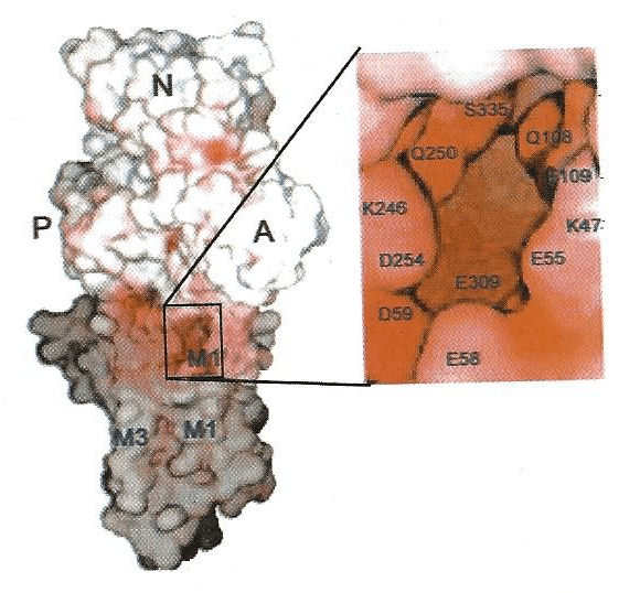 Figure. White represents the hydrophilic surfaces of the pump, exposed to the cell’s aqueous cytoplasm. Grey represents the hydrophobic portions of the surfaces of the pump residing within the lipid of the endoplasmic/sarcoplasmic reticulum membrane. The Ca2+ entry site is shown in the expanded box. The P, M, and A domains (hydrophilic) are generally positively charged. The M1 and M3 represent portions of transmembrane alpha helices. The lettered symbols in the enlarged inset to the right represent identified amino acids and their numbered positions in the protein sequence of the pump molecule. The enlarged inset for the Ca channel inlet shows its structure and position near the Ca binding site, which is deeper within the pump protein. This image is taken from supplementary material of reference (14).